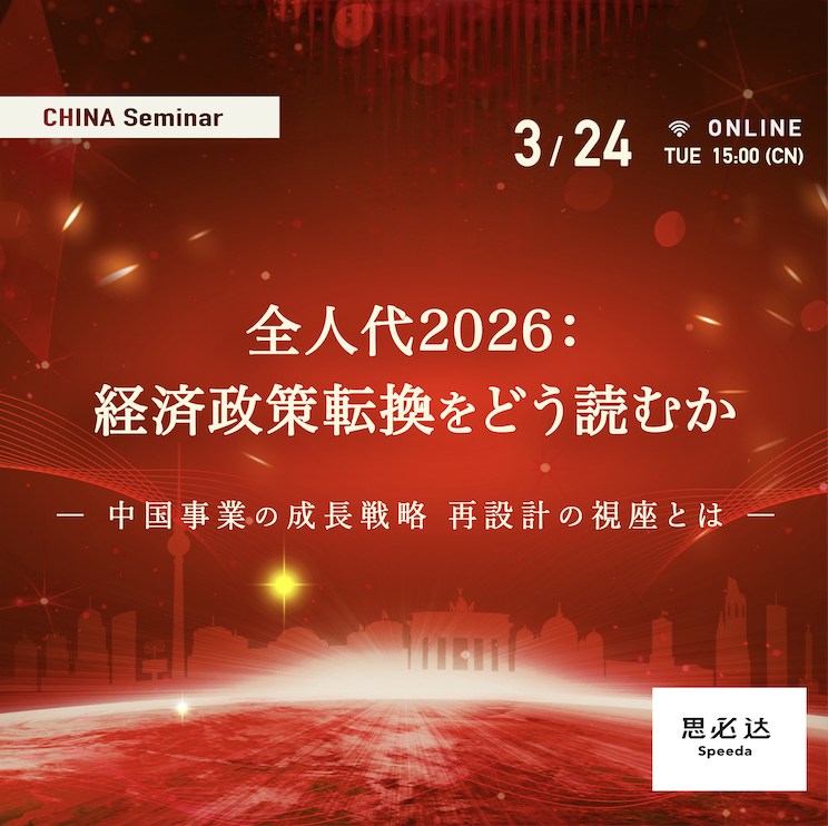 本セミナーでは、全人代の決定事項を単に解説するのではなく、この構造転換が日系企業のビジネスモデルにどのようなインパクトを与えるのかを深掘りします。丸紅・鈴木氏の実務的な視点と、Speeda専門家による多角的な分析を交差させ、中国事業の成長戦略を「再設計」するための真の視座を提示します。